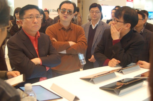 한상범 LG디스플레이 대표(왼쪽 첫번째)와 인유성 LG디스플레이 정보기술(IT)사업 본부장(왼쪽 두번째) 등 주요임원들이 부스를 찾아, 전시 제품들을 사전 점검하고 있다.