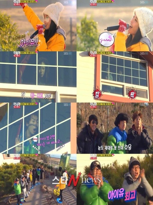 이날 아이유는 '런닝맨' 출연진들과 김성수, 주상욱, 지진희, 이천희 등이 숙박한 펜션을 찾아 이들을 깨우기 위해 두 곡을 열창하기 시작했다.