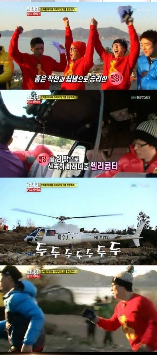 개그맨 유재석이 활약을 펼친 끝에 ‘런닝맨’ 빨강 팀이 헬리콥터 퇴근을 했다.