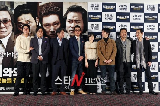 19일 오후 서울 CGV 왕십리 점에서 영화 ‘범죄와의 전쟁 : 나쁜놈들 전성시대’의 언론배급 시사회가 열린 가운데 참석자들이 기념촬영을 하고 있다.