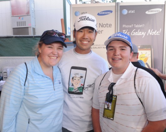 삼성전자는 지난 12일까지 미국 캘리포니아 페블비치에서 열린 'AT&T 페블비치 내셔널 프로암 골프대회'에서 AT&T와 함께 '갤럭시노트' 체험부스를 마련해 인기를 모았다. 재미교포 나상욱 선수가 갤럭시노트로 그린 자신의 캐리커처를 프린트해 새겨넣은 티셔츠를 입고 팬들과 사진촬영을 하고 있다.