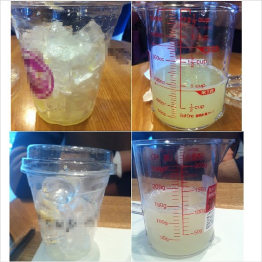 얼음을 뺀 후 음료량이 가장 적었던 곳은 ㄱ커피전문점의 레모네이드였다. 용기를 꽉 채웠던 정사각형 모양의 큼직한 얼음들을 빼고나니 수번 마시면 없어질 것처럼 적은 양의 음료가 남았다. 계량컵의 눈금은 작은 '팩우유'와 똑같은 200ml(밀리리터)를 가리켰다.
