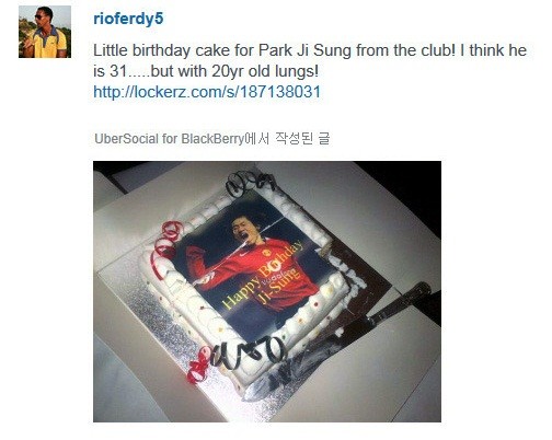 이어 퍼디난드는 “클럽에서 박지성을 위해 만든 작은 케이크! 그의 나이는 31살이지만....폐는 20살 같다”라고 소개글을 덧붙였다.