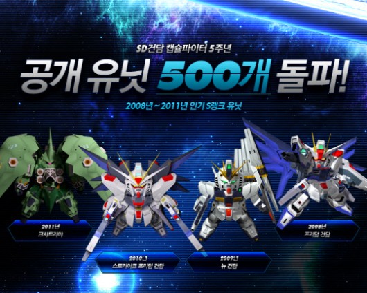 한편 'SD건담'이 서비스 5주년을 맞아 진행하는 빅 파이브 이벤트에서는 3월 9일까지 접속한 모든 사용자에게 S랭크 유닛을 지급하고, 3월 11일까지 5000개의 편의점 상품교환 이벤트와 나이키 루나 등 110개의 운동화 경품 이벤트를 진행한다.