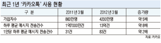 카카오는 서비스를 시작한 지 1년여 만인 지난해 4월 카카오톡 가입자 1000만명을 확보했다.