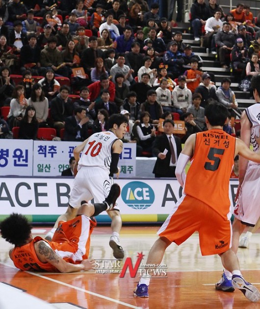 12일 오후 인천 산삼체육관에서 '2011-2012 KB 국민카드 프로농구' 인천 전자랜드와 부산 KT의 경기가 열린 가운데 전자랜드 주태수가 KT 조성민의 공격에 넘어지고 있다.