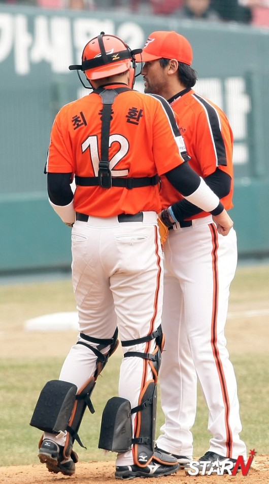 30일 오후 서울 잠실야구장에서 '2012 프로야구 시범경기' 한화 이글스와 LG 트윈스의 시범경기가 열린가운데 한화의 최승환과 박찬호가 서로 이야기를 나누고 있다.