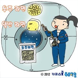 따라서 우주음식으로 가져갔던 라면은 미지근한 물에서도 면이 잘 복원되도록 개발되었습니다. 그 면은 최첨단 진공건조기술을 이용하여 라면의 단면에 무수히 많은 구멍을 낸 다공성 면입니다. 또한 수프 분말이 날리면 우주선의 여러 장비에 손상을 줄 수 있기 때문에 면과 수프가 함께 혼합돼 있도록 만들었습니다. 포장은 우주선 안에서 손쉽게 물과 혼합할 수 있도록 튜브가 달린 특수 파우치 팩을 이용하였는데 튜브를 열고 더운 물을 받아 라면과 잘 섞어 비빔면 형태로 먹는 것이지요. 우리나라에서 개발된 우주라면은 우주인들에게 인기가 좋았던 우주 음식 메뉴 중 하나였답니다.