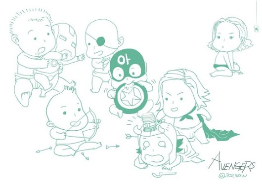 공개된 그림은 현재 네이버 웹툰 ‘스페이스 차이나드레스’를 연재중인 원현재 작가가 그린 것으로 영화 ‘어벤져스’에 등장하는 모든 슈퍼히어로들을 아기로 탈바꿈시켜놓았다.