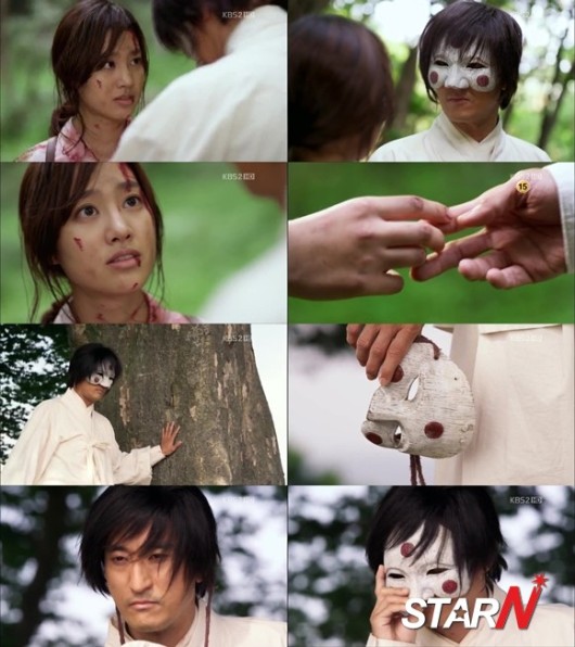 이어 그는 목단을 구해 말을 타고 숲속으로 피했으며 이에 목단은 “정말 고마워요. 근데 그 위험을 무릅쓰고 왜 자꾸 절 도와주시는거죠? 전 목단이에요. 당신은요? 이름이라도”라며 각시탈에 정체에 대해 궁금해했다.