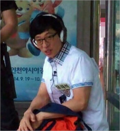 사진 속에서 유재석은 하늘색 체크무늬의 교복을 입고 있었으며 헤드폰과 패션 가방을 든 채 카메라를 응시하고 있다.