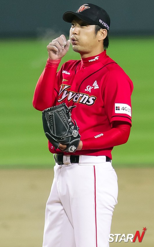 14일 오후 잠실구장에서 ‘2012 팔도 프로야구’ LG 트윈스와 SK 와이번스의 경기가 열린 가운데 SK의 엄정욱이 투구전 로진을 바르고 있다.