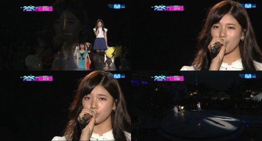 국민 첫사랑이라는 별칭처럼 청순한 생머리와 흰 블라우스, 깔끔한 남색 치마를 입고 무대에 오른 수지는 애절한 가창력을 선보이며 본연의 가수로서의 모습을 과시했다.