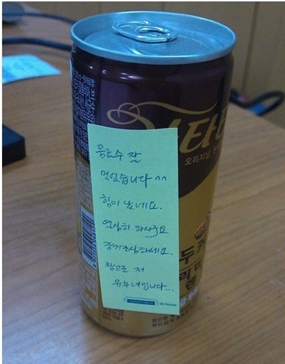해당 ‘도서관 고백 실패’ 사진에서 캔 커피에 부착된 쪽지엔 ‘음료수 잘 먹었습니다.