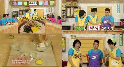 지난 28일 방송된 KBS2 ‘해피투게더3’의 새 코너 ‘야간매점’에는 장동민이 자신의 요리 스프밥의 레시피를 공개해 관심을 모았다,