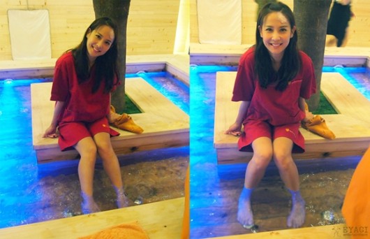 공개된 사진 속 조여정은 분홍색 찜질방 옷을 입고 흐르는 물에 발을 담근 채 휴식을 취하며 촬영을 준비 하고 있는 모습.