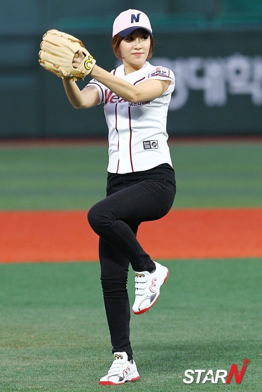 14일 오후 서울 목동 야구장에서 '2012 팔도 프로야구' 넥센 히어로즈와 한화 이글스의 경기가 열린 가운데 최희 아나운서가 시구를 하고 있다.