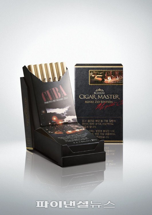 '보헴 시가마스터 MINKI ZIO 에디션'은 기존 제품과는 달리 담뱃갑을 펼치면 'ㄴ'자 모양으로 세울 수 있는 특수 폴더 형태로 수작업을 통해 제작됐다. 최근 사진작가로도 활동 중인 조씨는 직접 촬영한 쿠바 말레콘 비치의 풍경사진을 패키지 내부에 담아 쿠바의 이국적 정취를 표현했다.