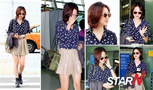 이날 파리로 출국한 공효진은 별무늬가 새겨진 네이비 컬러의 블라우스에 베이지색 주름치마로 패셔니스타 다운 면모를 유감없이 발휘했다.