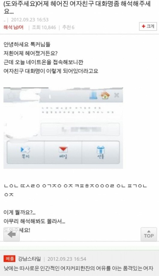 글을 올린 남성은 “어제 헤어진 여자친구의 대화명을 해석해 달라”며 사진을 공개했고 사진에는 ‘ㄴoㄴ ㄸㅅㄹㅇ ㅇㄱㅈㅇ ㅇㅈ ㅋㅍㅎㅈㅇ ㅇㅇㄹ ㅇㄴ ㅍㄱㅇㄴ ㅇㅈ’라는 알 수 없는 대화명이 적혀 있다.