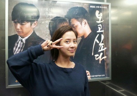 공개된 사진 속에는 송지효가 박유천, 윤은혜 주연의 MBC 새 수목드라마 ‘보고싶다’의 포스터 앞에서 브이포즈로 카메라를 응시하고 있는 모습이다.