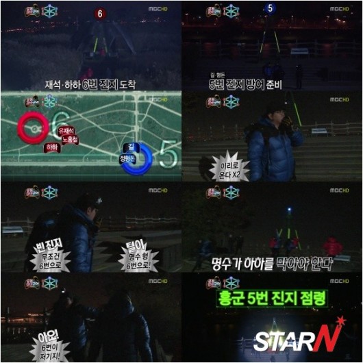 하지만 홍군은 무작정 6번으로 달려 정면 승부를 벌이려 했고 당황한 정형돈은 “이 쪽으로 다 오고 있으니까 5번이 비어있다”라며 “명수 형이 거기 가서 깃발을 꽂으면 된다”라고 다급하게 무전기를 쳤다.