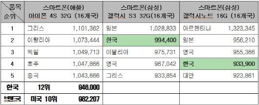 스마트폰의 경우 국내 판매가격은 18개국 중 갤럭시S3가 99만4400원으로 2위에 올랐고 갤럭시노트는 93만3900원으로 4위였다.
