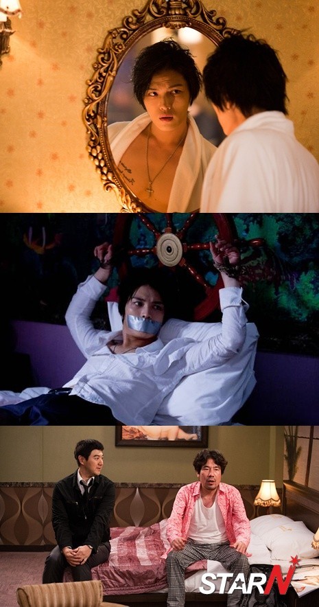 두 손을 묶인 채 침대 위에 누워 당황한 눈빛으로 어딘가를 바라보고 있는 김재중. 킬러 봉민정(송지효)에게 납치당한 그가 셔츠를 풀어헤친 채 심상치 않은 포즈로 누워있는 이유는 무엇인지, 그리고 과연 앞으로 그에게 어떤 일이 벌어질 것인지 관객들의 의문을 증폭시키기도.