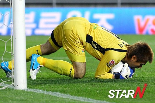 경남 수문장 김병지(42)가 몸을 사리지 않는 플레이로 팀을 패배의 위기에서 구해냈다.