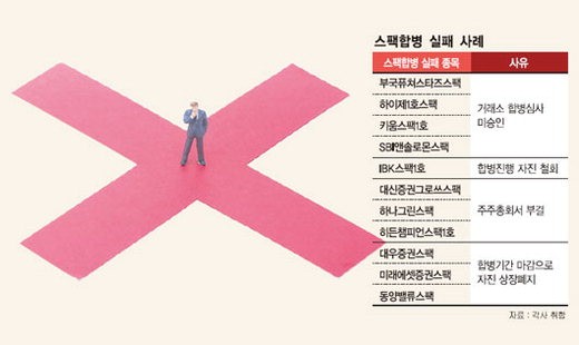 스팩(SPAC·기업인수목적회사)이 계속된 기관의 말 바꾸기로 청산될 위기에 처했다. 시장 침체 속에 어렵사리 피합병기업을 찾는다 해도 한국거래소의 강화된 심사에 번번이 고배를 마시고 있어서다. 특히 기관투자가들의 이해관계로 합병을 눈앞에 두고 줄줄이 상장폐지 절차를 밟고 있다.
