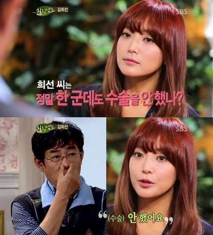 이날 방송에서 김희선은 “얼굴에 정말 한 군데도 손대지 않았냐. 코는 한 것 같다”는 MC 이경규의 질문에 “안 했다”고 답해 눈길을 끌었다.