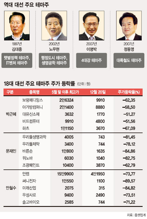 고점 대비 90% 하락한 안철수 테마주 미래산업과 써니전자가 대표적이다. 미래산업 최대주주인 정문술 회장은 주가가 고점을 찍자 보유주식 2254만주 전량을 402억원에 매도했다. 써니전자 곽영의 회장과 곽경훈 사장 등 최대주주 일가가 지난 5~12월 수차례 주식을 장내매도해 173억원의 실탄을 챙겼다.