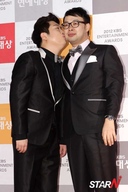 개그맨 김장군, 권재관이 22일 오후 서울 영등포구 여의도동에 위치한 KBS 신관 TV 공개홀에서 진행된 ‘2012 KBS 연예대상’에 참석한 가운데 포토타임을 갖고 있다.