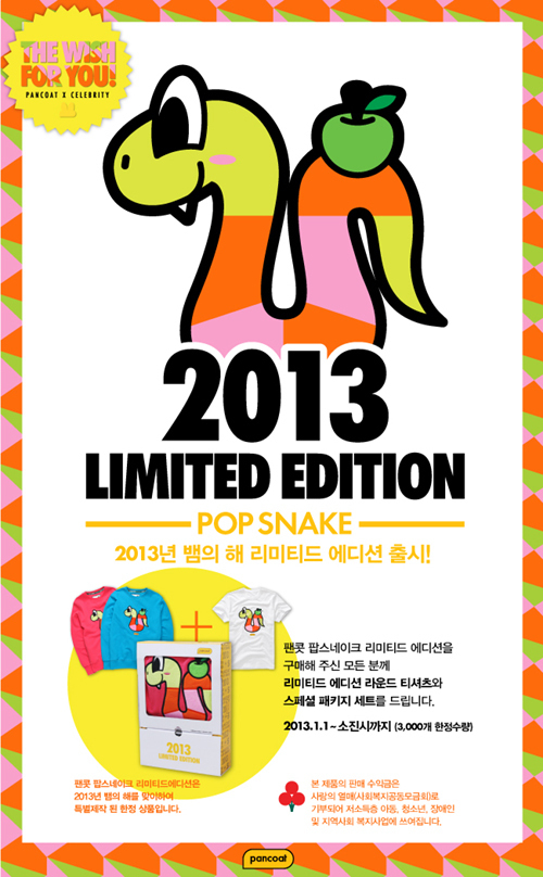 ㈜브랜드인덱스(대표 김민식)의 스트리트 캐주얼 브랜드‘팬콧(pancoat)’이 2013년 ‘뱀의 해’를 맞아 오는 1월 1일 리미티드에디션 ‘팝스네이크(POP SNAKE)’ 맨투맨 티셔츠를 출시한다.