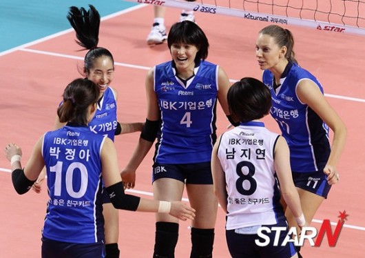 '2012-2013 NH농협 V-리그' 여자 프로배구 IBK 기업은행과 현대건설의 경기가 2일 오후 화성 종합실내체육관에서 열린 가운데 기업은행 선수들이 득점에 기뻐하고 있다.