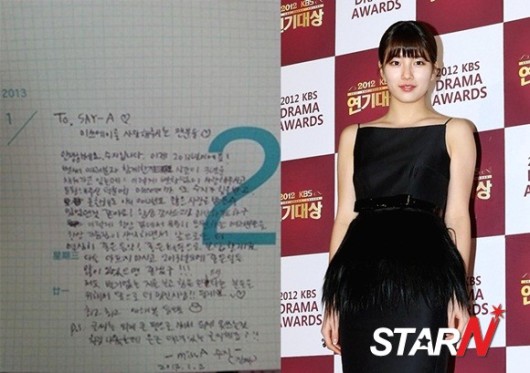 공개된 편지에서 수지는 "안녕하세요. 수지입니다. 이제 2013년이에요. 벌써 여러분과 함께한 시간이 3년을 채워가고 있네요. 이렇게 변함없이 사랑해주시고 응원해주신 덕분에 미쓰에이가, 또 수지가 힘을 받고 2012년도 많은 사랑을 받을 수 있었던 것 같아요"라고 적었다.