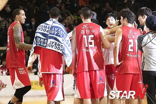 ‘2012~2013 KB국민카드 프로농구’ 서울 SK 나이츠와 전주 KCC 이지스의 경기가 28일 오후 서울 잠실학생체육관에서 열린 가운데, 서울 SK 나이츠 선수들이 승리의 하이파이브를 나누고 있다.