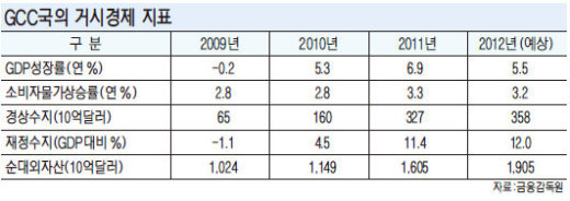 한편 고유가가 지속되면서 중동 걸프만협력회의(GCC) 국가의 국내총생산(GDP) 성장률은 지난 2011년 6.9%, 지난해 5.5%로 예상되는 등 고성장을 지속하고 있다.