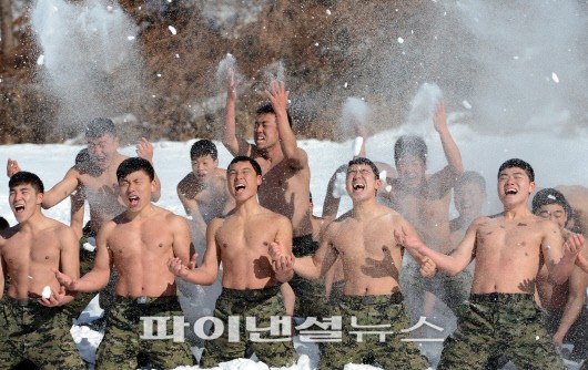 특전용사들이 눈밭에서 체력단련을 하고 있다. /사진=박범준기자
