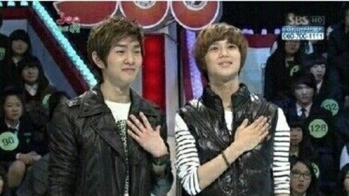 공개된 사진에는 SBS 예능 프로그램에 출연한 샤이니 온유와 태민이 왼쪽 가슴에 손을 올리고 있는 모습이 담겨 있다.