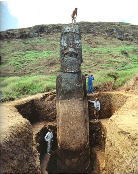 게재된 모아이 석상의 실체 사진에는 칠레 이스터 섬에 위치한 모아이 석상의 밑둥을 드러내는 작업하는 사람들의 모습이 담겨 있다.