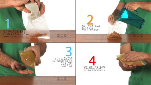 그 후 자석을 손 바닥에 둔 상태에서 시리얼 봉지를 자석 위에 포개고 천천히 15~20초 가량 흔들어 준다.