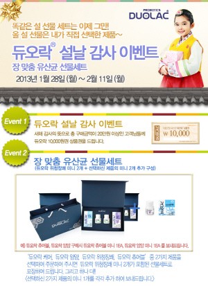 다음달 11일까지 판매되는 설 선물세트에는 장 건강은 물론, 과식이나 기름진 음식으로 장 건강이 염려되시는 분을 위해 하루 2캡슐로 편안하게 관리할 수 있는 '듀오락위청장쾌' 미니 제품 4일분이 추가로 구성되며, 직접 고른 2가지 제품의 미니 제품 4일분도 증정된다. 총 8일분의 미니 제품이 추가 증정돼, 듀오락 정품(30일분)의 1/3 가량을 더 받을 수 있는 셈이다.
