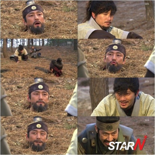 머리만 빼고 땅에 묻힌 이성계는 눈을 뜨자마자 주변을 살폈고 이어 꾸벅꾸벅 졸고 있는 우야숙을 부르며 “이게 대체 무슨 꼴이냐!”라고 소리쳤지만 반응이 없자 “지상아 눈 좀 떠봐라”라고 다급해했다.