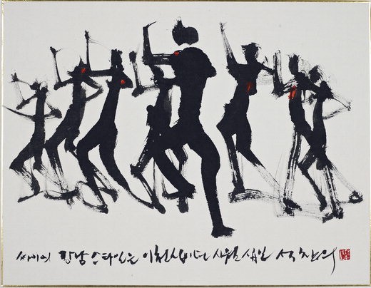이 그림은 과연 무엇을 그린 것일까. 싸이? 말춤? 강남스타일? 모두 정답이다. '수묵 크로키'를 통해 역동적인 인체의 움직임을 포착해온 '의수 화가' 석창우(58)의 신작 '싸이 16'이다. 2만2000V의 고압전류에 두 팔을 잃은 석 화백은 의수 끝에 매달린 갈고리에 붓을 끼워 그림을 그린다. 손이나 팔이 아니라 온몸으로 그림을 그리는 셈이다. 두 팔이 없는 석 화백이 빠르게 움직이는 인체의 형상을 크로키 기법으로 빠르게 그려낸다는 사실이 역설적이다.