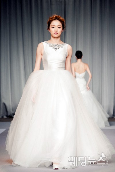 ◇ 모두에게 어울리는 A 라인 = A 라인 웨딩드레스는 상체는 꽉 조이고 하체는 치마 모양이 알파벳 A처럼 삼각형을 이뤄 내려오는 실루엣의 드레스다. 벨라인과 전체적으로 비슷하지만 벨라인 실루엣이 봉긋하게 둥글게 솟았고, A 라인은 솟은 부분 없이 직선으로 사선을 이루며 떨어지는 것이 다른 점이다. 벨라인과 A라인 모두 치마 아래로 내려갈수록 넓게 퍼져서 안정감을 주고, 하체가 통통한 신부의 단점을 보완해줄 수 있다.