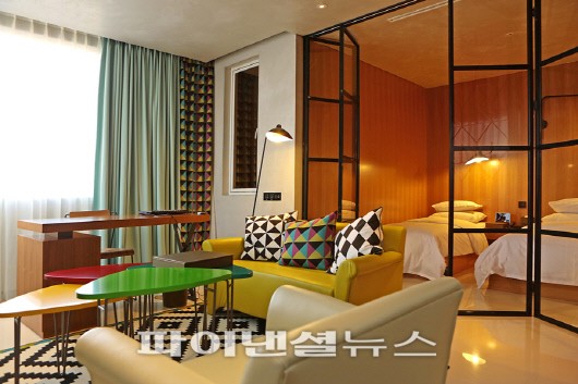 이번에도 삼성점 객실을 디자인했던 디자이너 중 5명이 참여해 '뉴욕과 런던 사이의 홍대'라는 컨셉트로 도회적인 시크함과 여행의 여유로움을 느낄 수 있는 분위기로 꾸몄다고 호텔측은 설명했다.