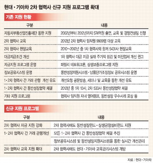 현대.기아차 관계자는 "자금 지원, 거래 관행 개선, 교육 확대 등 다양한 방안을 통해 1차 협력사는 물론 직접 거래 관계가 없는 2차 협력사의 경쟁력까지 끌어올려 완성차 업체와 협력사가 상생할 수 있는 동반성장 모델을 구축하겠다"고 말했다.