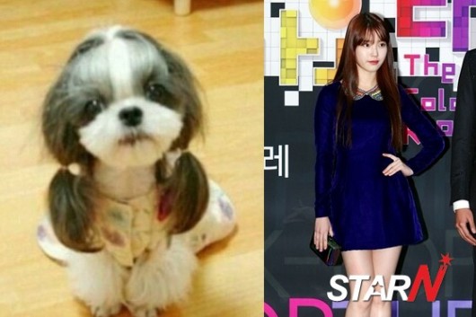 특히 해당 사진 속 강아지는 아이유가 평소 자주 선보이던 양갈래 헤어스타일을 하고 있어 보는 이들의 웃음을 자아냈다.