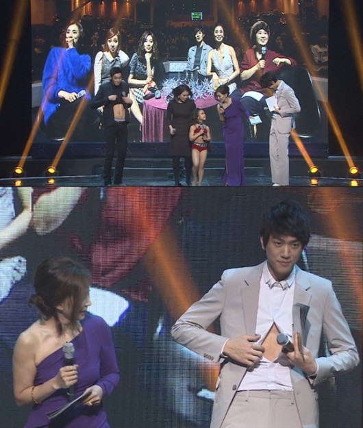 이에 두 남자가 당황해하는 모습을 보이며 망설이자 관객들은 기다렸다는 듯 두MC의 이름을 외치며 복근 공개를 요구했다.